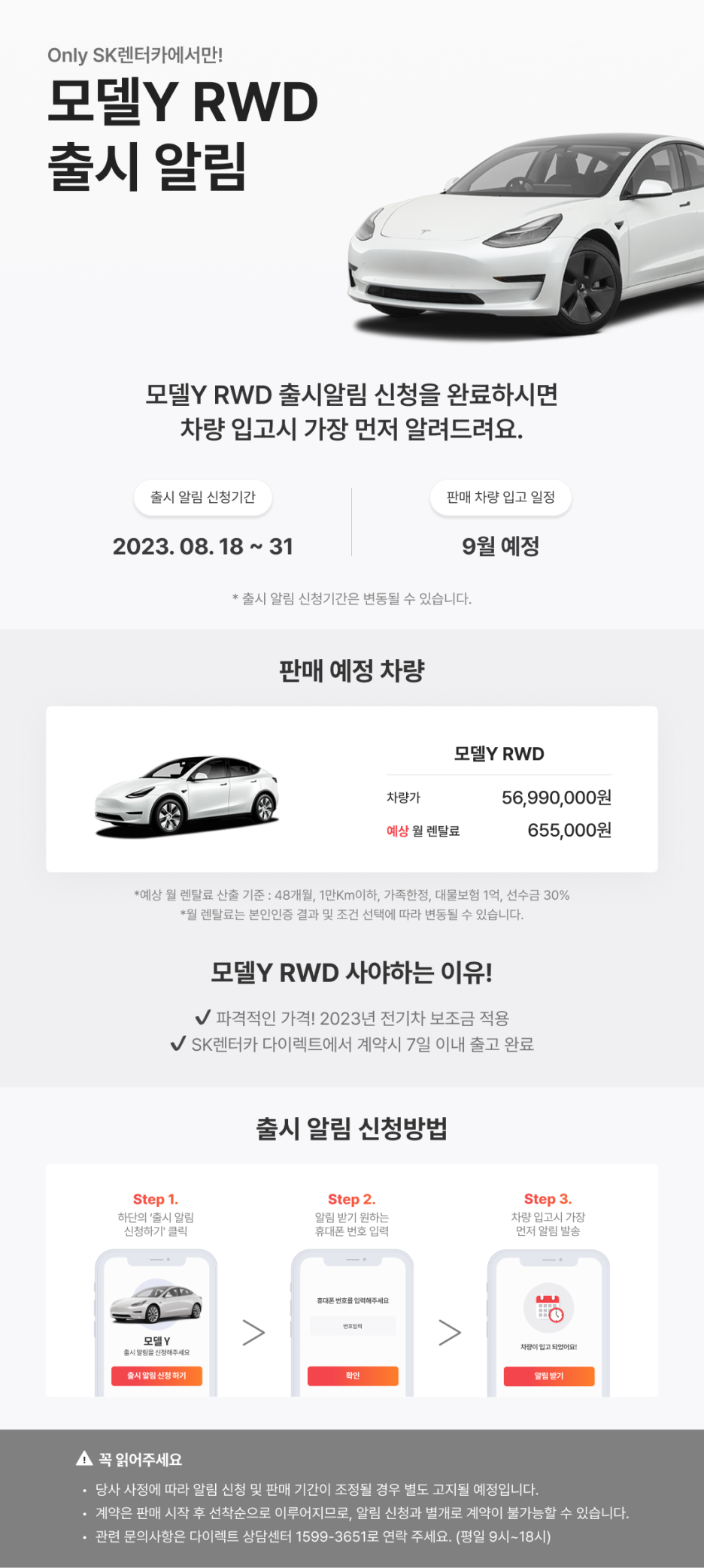 편리한 예약 및 신청: SK렌터카 다이렉트의 웹사이트를 통해 모델 Y RWD의 장기렌트를 신청하실 수 있습니다. 간편한 신청 절차를 통해 어렵지 않게 원하는 렌트 기간을 선택하고 예약할 수 있습니다.